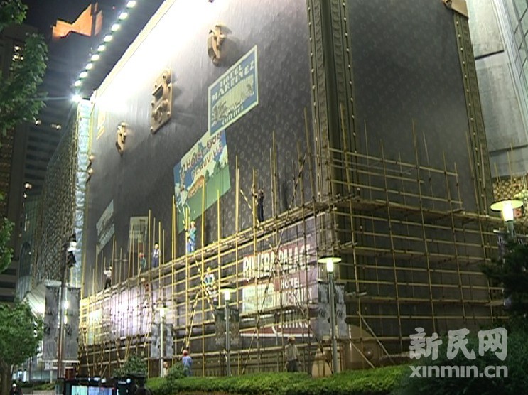 据正在现场的静安区绿化和市容、城管等部门工作人员介绍,脚手架搭好后,他们将扯去广告布,27米高、约4米厚的“LV箱”将被彻底整改。