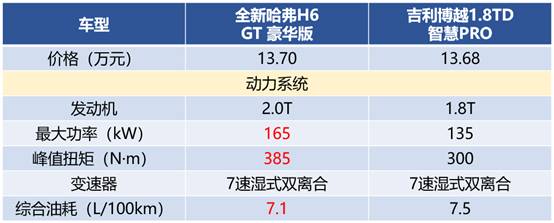 首先对比动力,由下表可以看出,全新哈H6 GT版在发动机参数上全面碾压吉利博越PRO