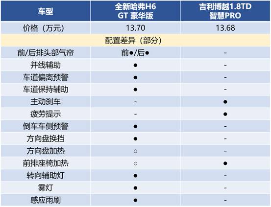 接下来对比配置,通过下面表格不难发现,虽然吉利博越PRO拥有几项全新哈H6 GT版不具备的配置,但全新哈H6 GT版的配置却更加全面,优势配置更多,表现更出色。