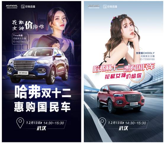 作为中国SUV的“排头兵”,哈同样也是多元化营销的大师。201912,哈顺势行业潮流,将与花椒直播平台合作,联手打造全新哈H6年终“花椒女神价给你,哈12,惠购国民车”活动。届时,花椒当红主播Nagisa_sasa酱、Tina荣酱、安安是辣味、大小姐等10位主播将现身全国哈54S门店,以KOL矩阵的形式全面解读国民神车哈弗H6,带领直播间用户体验售前、售中、售后的购车流程。让直播间用户真正了解哈H6是如何做到销量即将突破300万台,累计78个月成为SUV销冠军的国民神车。全面解读的同时还会为直播间的用户献上精彩的才艺表演及现场互动。