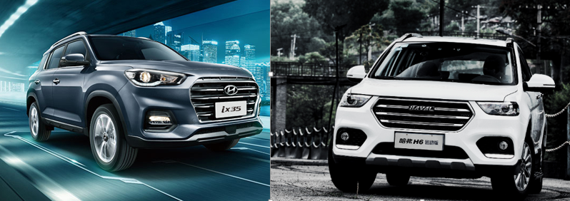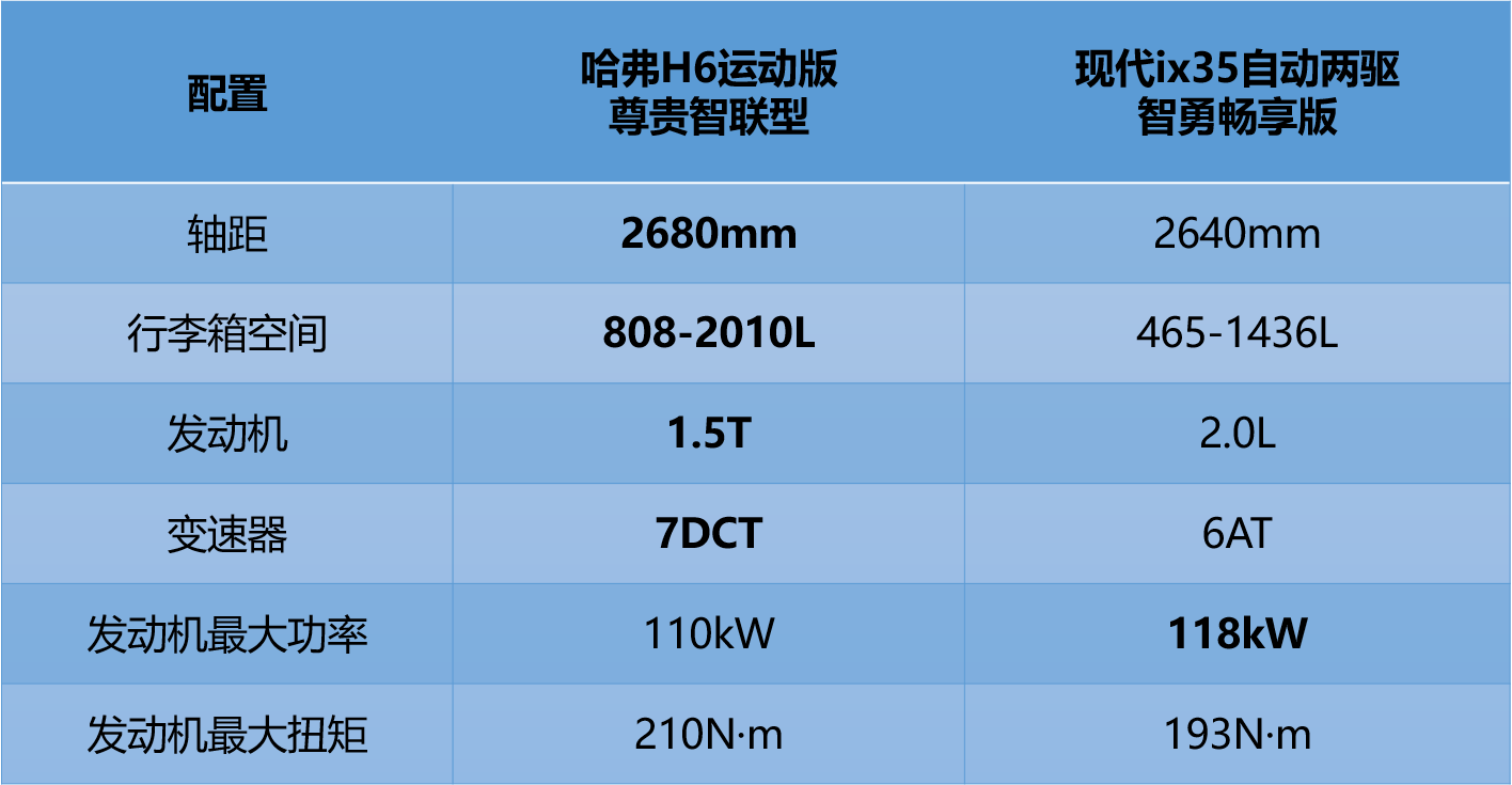 在产品实力方面,我们将通过横向对比哈H6和现代ix35款车,找到哈能够笑傲车市的核心元素。为保证公平性,我们将选择哈H6运动版尊贵智联型(简称哈H6运动版)、现代ix35自动两驱智勇畅享版(简称ix35)两款车型进行对比。