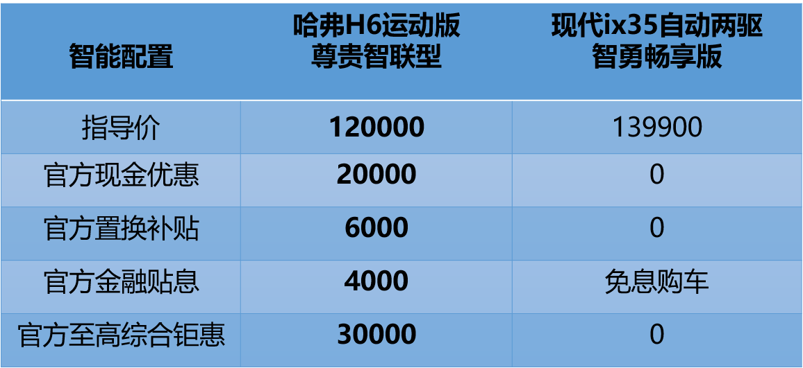 通过对比,我们不难发现哈H6运动版在智能配置、空间表现以及动力输出等方面拥有绝对的优势,相比ix35将近14万的指导价,哈H6运动版尊贵智联型的售价仅为12万元,更具竞争力。同时,时至年终季,哈更是推出一系列惠活动,哈H6运动版可享受包含现金优惠20000元、专享置换补贴至高6000元以及金融贴息至高4000元在内至高30000元的综合惠,不仅孩子的早教课学费省下了,就连老婆心爱的包包都能抱回家,可谓业界良心,而现代品牌仅推出免息购车等官方金融政策吸引用户关注,二者之间同样存在一定差距。