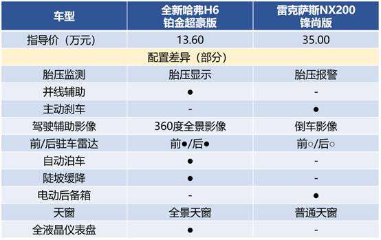 以驻车雷达和倒车影像为例,这两项配置实用性很高,也是很多用户的刚需。全新哈H6铂金版拥有/后驻车雷达和高清360度全景影像,几乎武装到了顶端。而雷克萨斯NX200只有普通的倒车影像,驻车雷达还得选配,试问如何体现“豪华”二字?