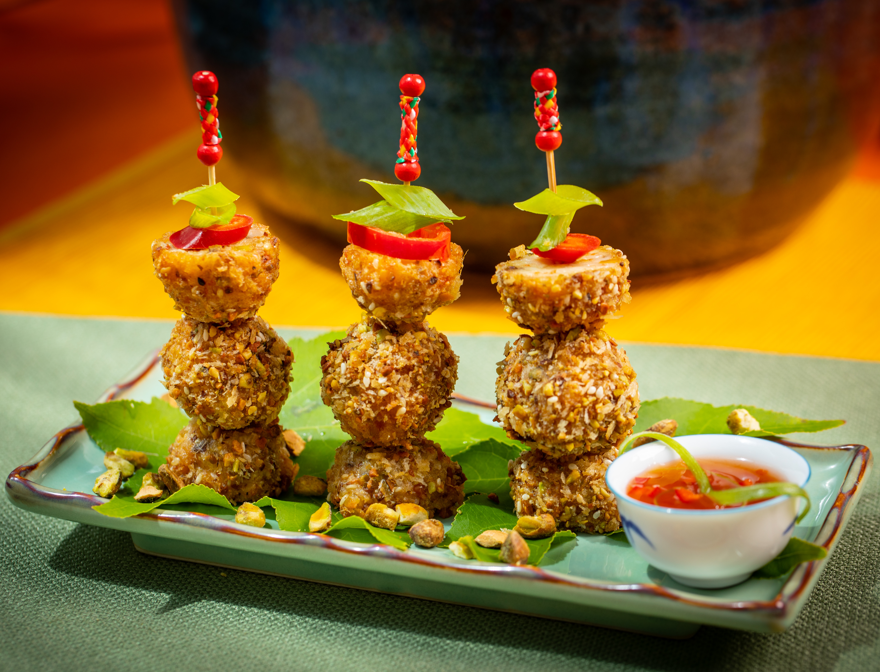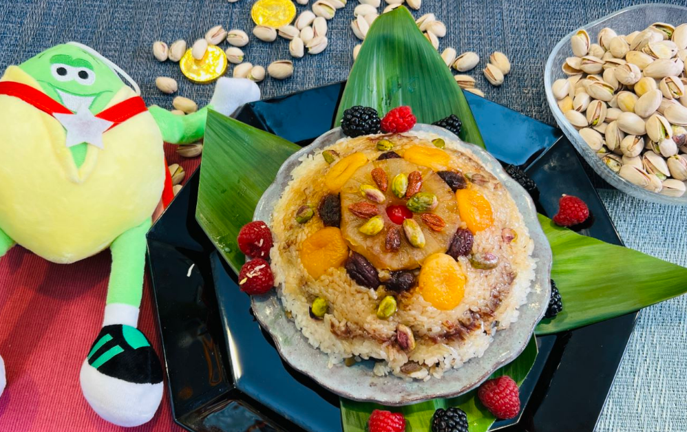 他们身处喜庆热闹的直播间,在国际名厨甄文达的带领下,加州小姐梁滢也一起加入到烹饪的环节中,为大家带来了极具中国特色的三道美食,开心元宝虾丸,造型如同金元宝一样,这道菜老少皆宜,弹牙美味。作为广东人的甄文达大厨,过年的传统就是吃盆菜,开心兔年盆菜,盆满钵满,丰财聚宝,寓意团团圆圆,幸福美满,这道菜食材丰富,营养高,寓意好。最后还有压轴登场的开心八宝饭,每一道菜中都加入了开心果,不仅色香味俱全,又简单易上手,很适合在中国的新年佳节,用来招待亲朋好友。